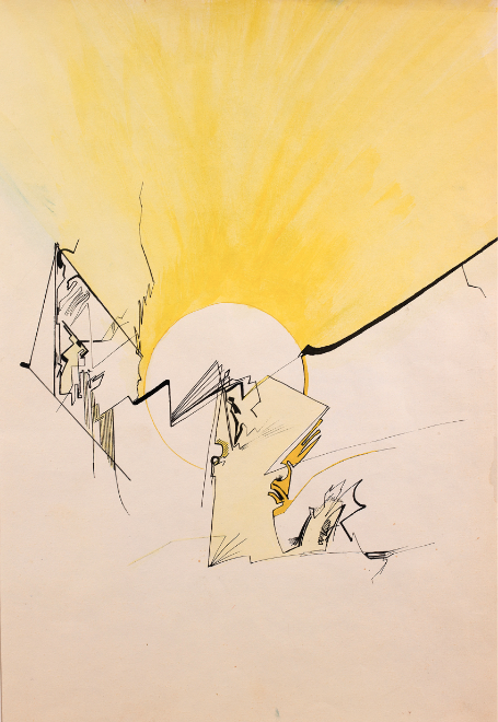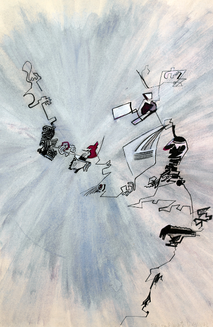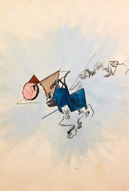 Calligraphie n°4, Encre et aquarelle sur papier L’œuvre d’Elisabeth Delesalle est ponctuée de plusieurs périodes de créations de 1971 à 2019. Ses premiers dessins en 1971 présentent des motifs abstraits à l’encre et rotring dans lesquels apparaissent des éléments de figurations, dont les surfaces se détachent grâce à la couleur de l’encre de chine utilisée en aplat.