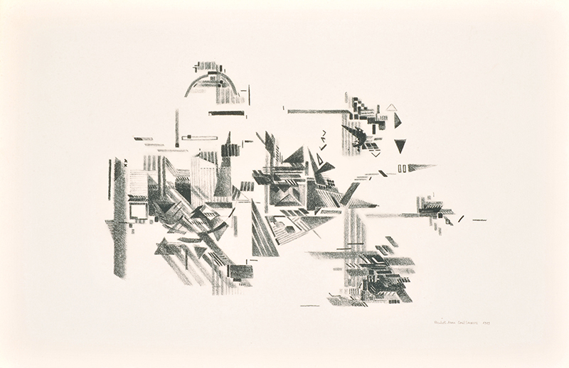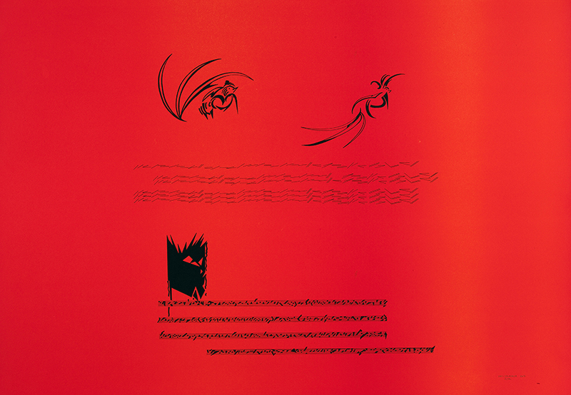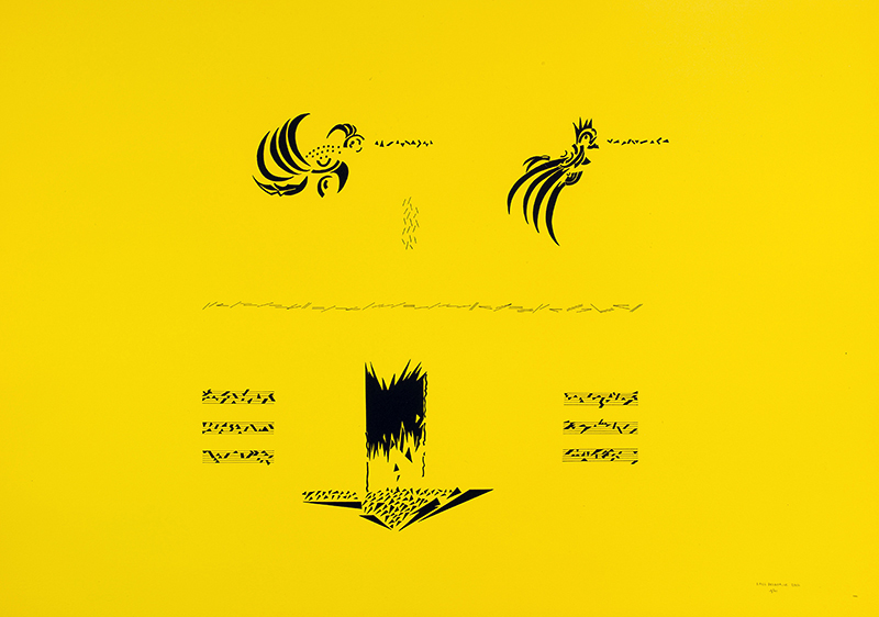 Lithographie, 1990, 54 x 75 cm, Noire Les lithographies ont été réalisées en 2012, elles font partie du procédé artistique d’Elisabeth Delesalle depuis ses débuts; son travail a évolué vers un motif aérien de figures qui avoisinent poésie, rythmique graphique et composition géométrique sur la planéité du papier. L’usage de couleurs primaires franches et d’une forme de non-figuration font d’une certaine manière écho aux oeuvres de Juan Miro, dans une assimilation plus contemporaine du motif, imprégné de culture visuelle.