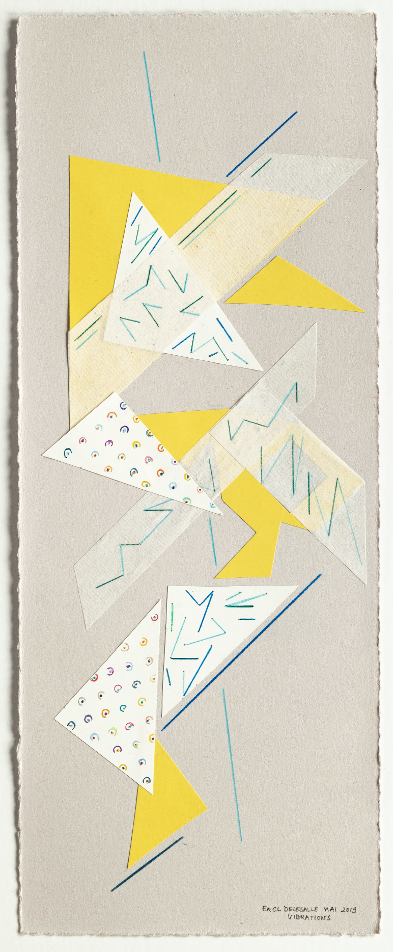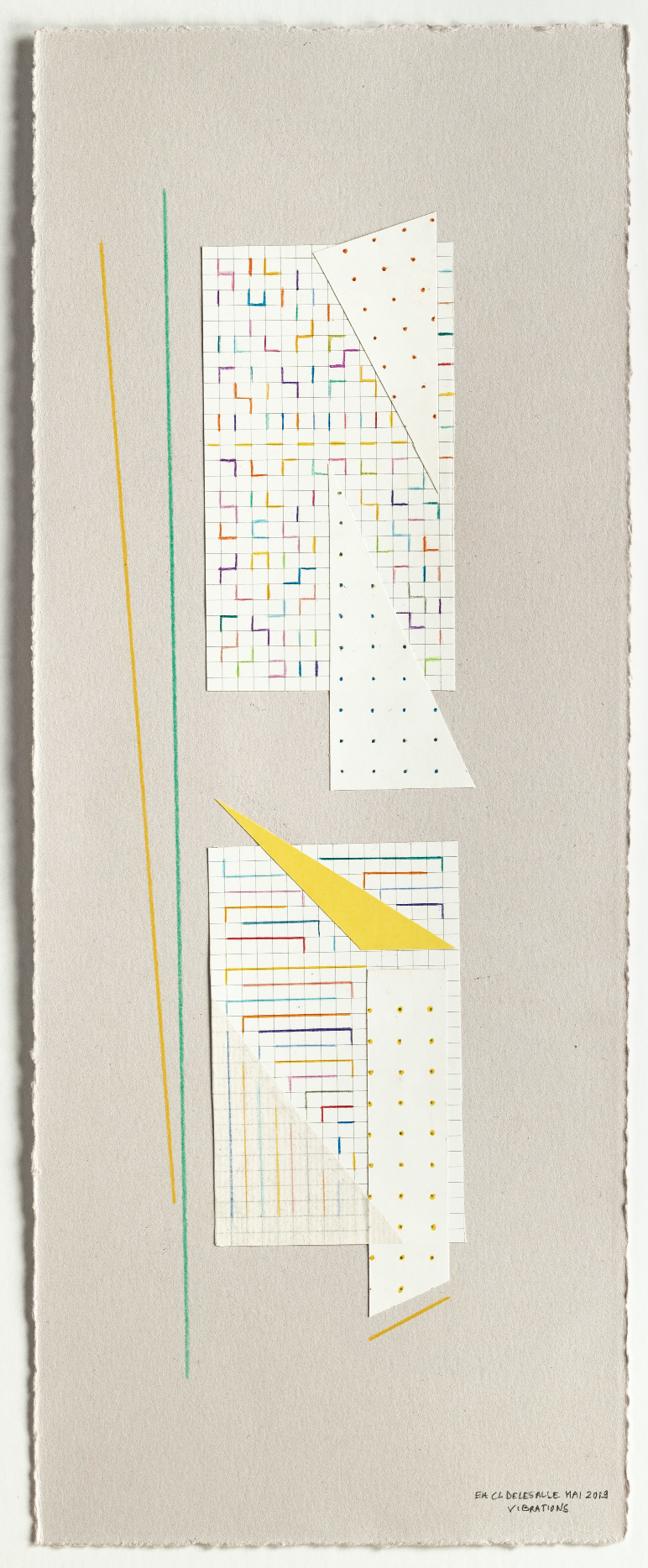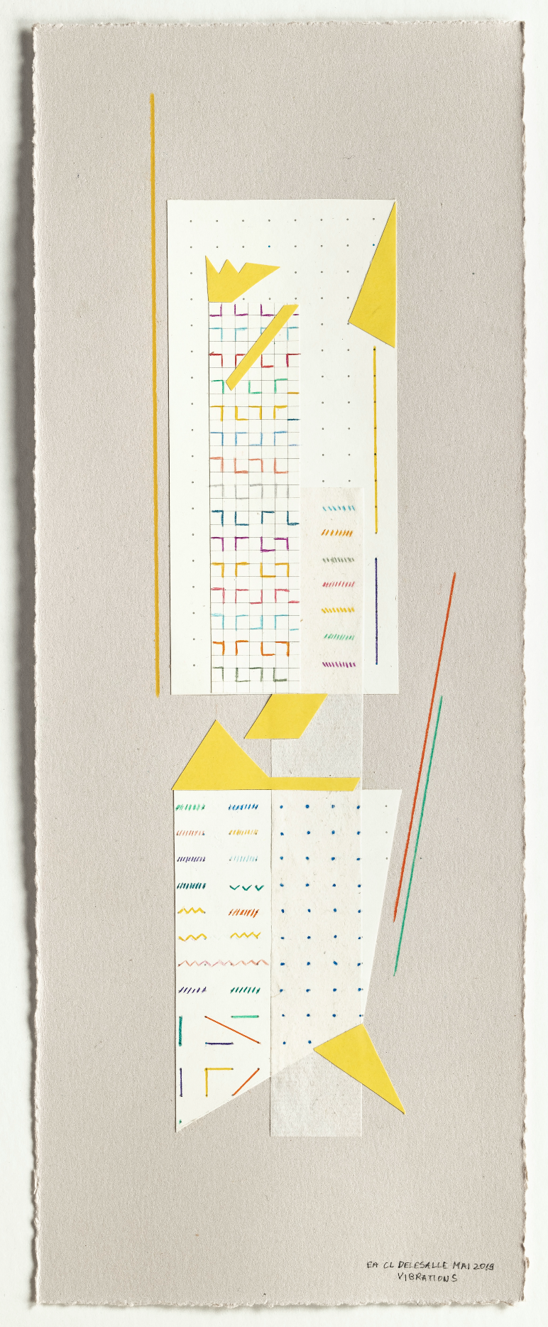 Vibrations, 2019, Collage et crayon de couleur Des compositions réfléchies, dans un agencement où les papiers