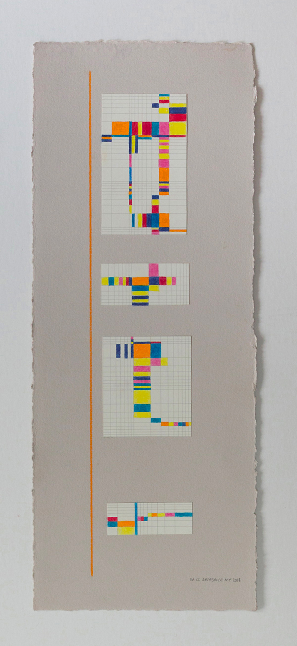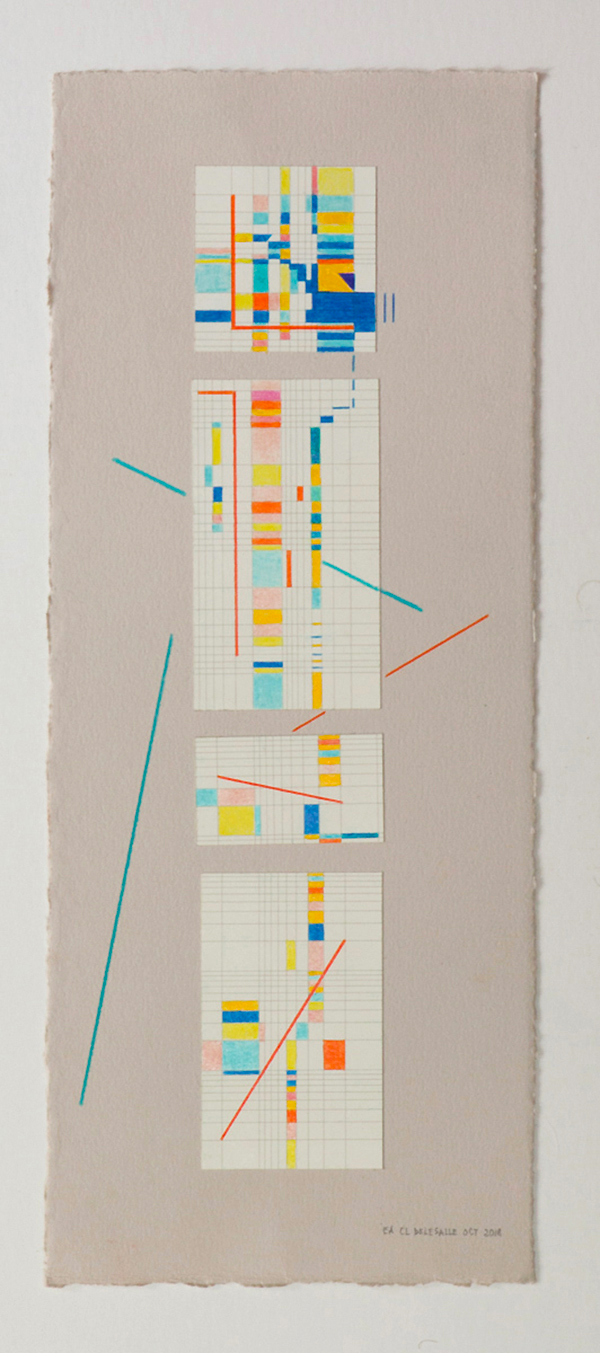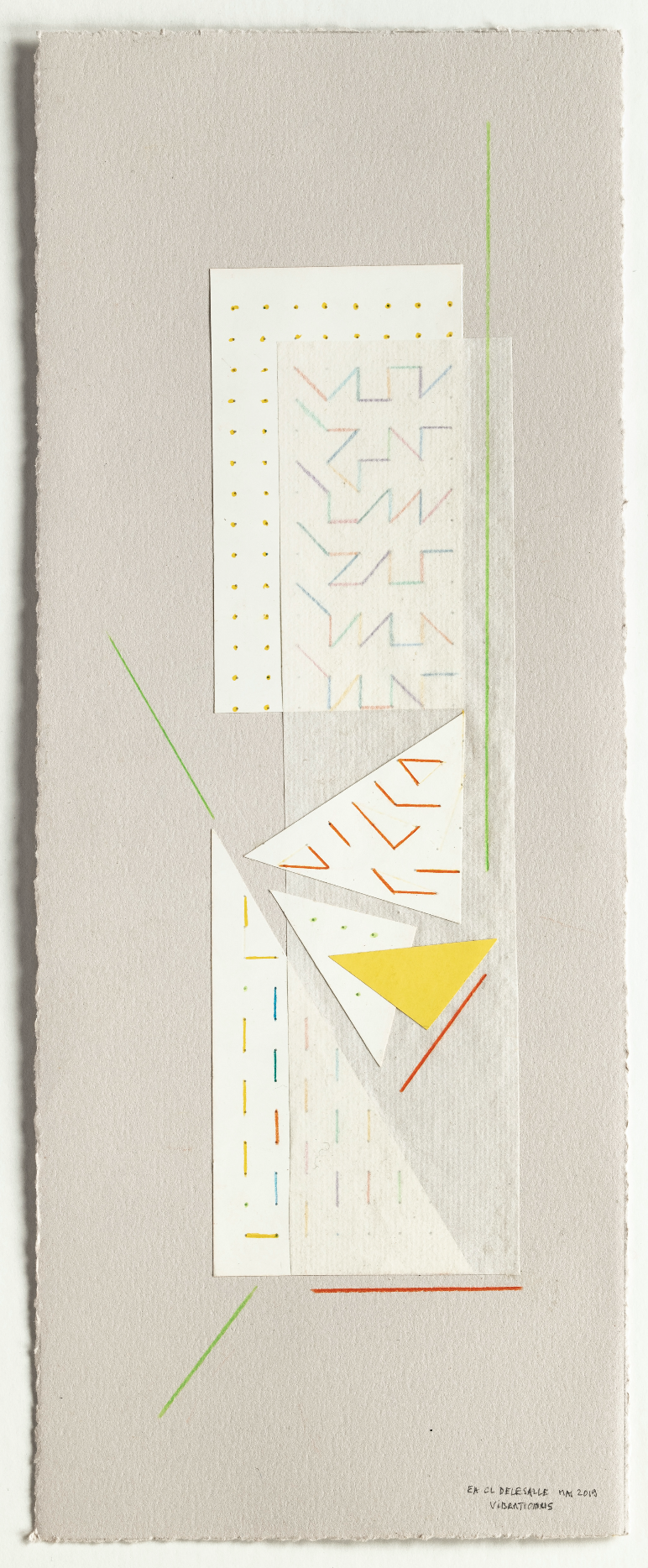 Vibrations, 2019, Collage et crayon de couleur Des compositions réfléchies, dans un agencement où les papiers