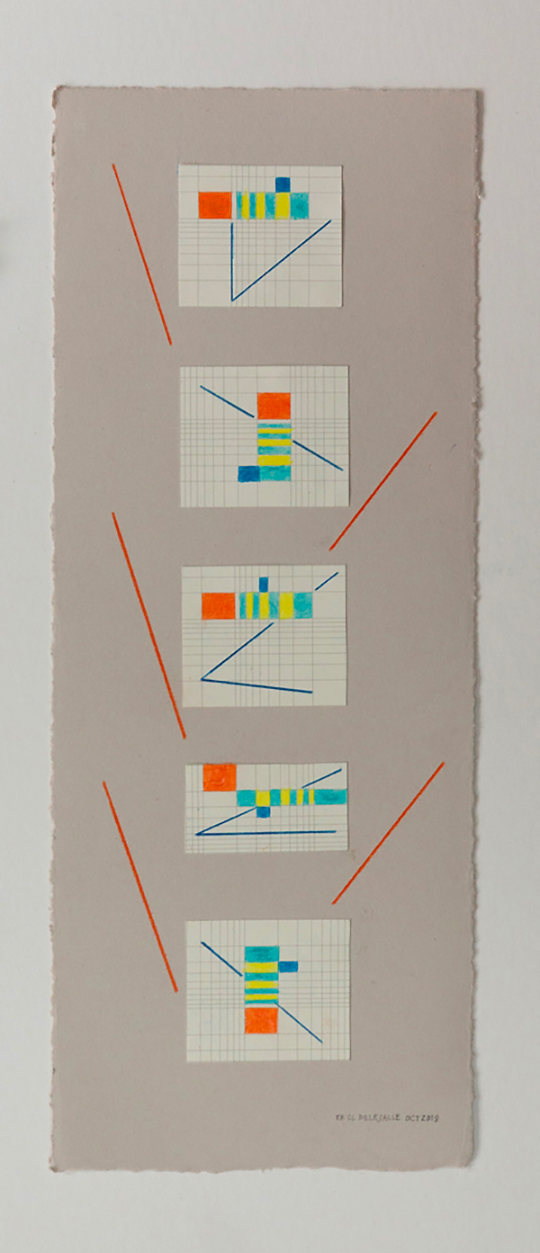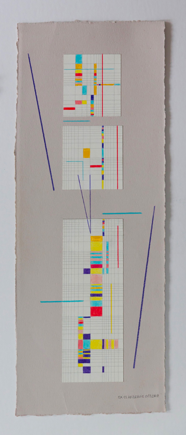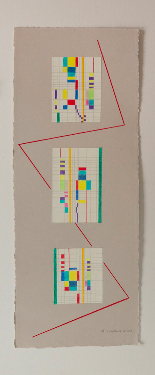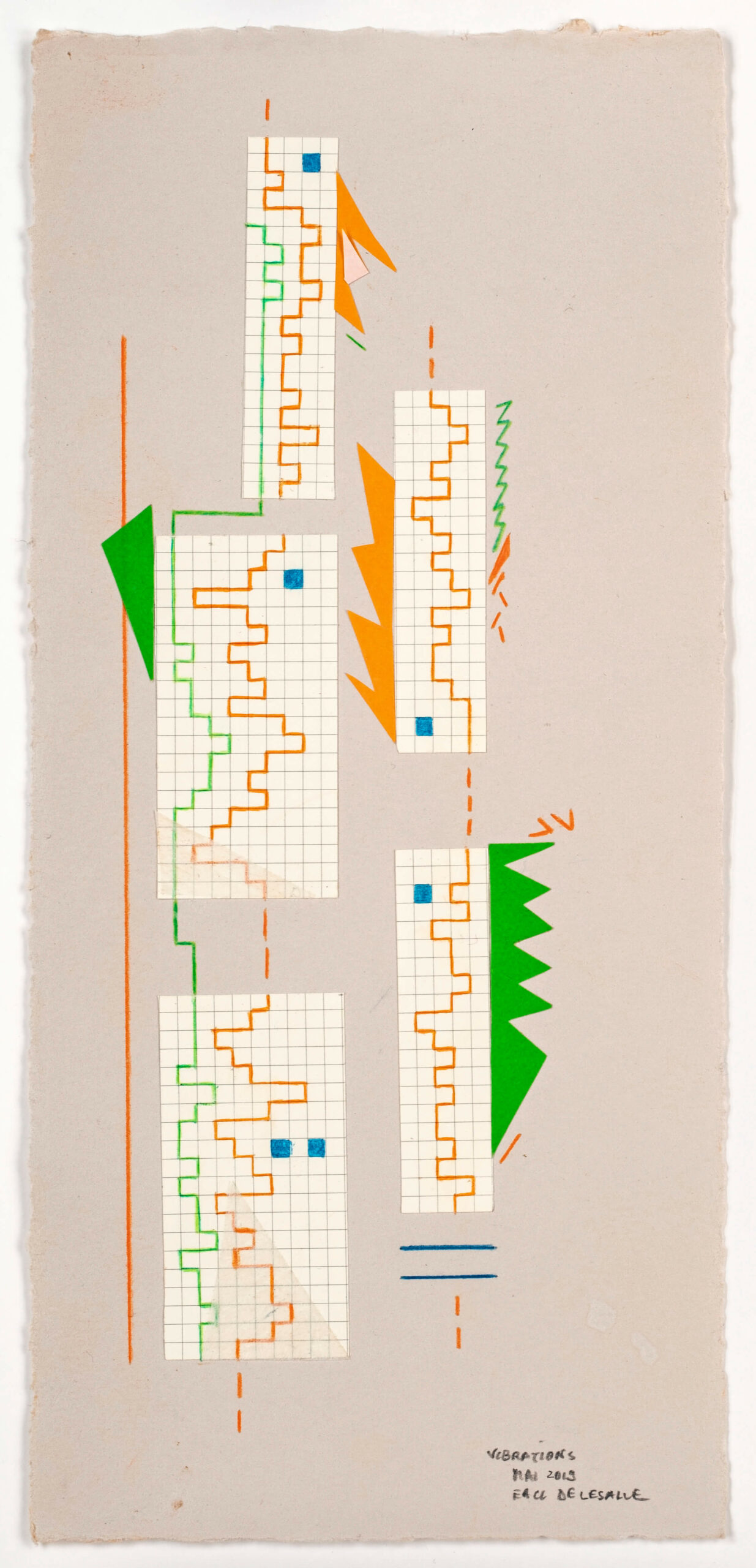 Collages et écriture s’entremêlent et nous proposent une lecture emplie d’émotion.La série Vibrations réalisée en 2019, est un des travaux d’Elisabeth Delesalle qui réfère directement à la musique. Par l’utilisation d’un papier à carreaux, prenant allure de partitions où les notes s’inscrivent dans une abstraction en équilibre.